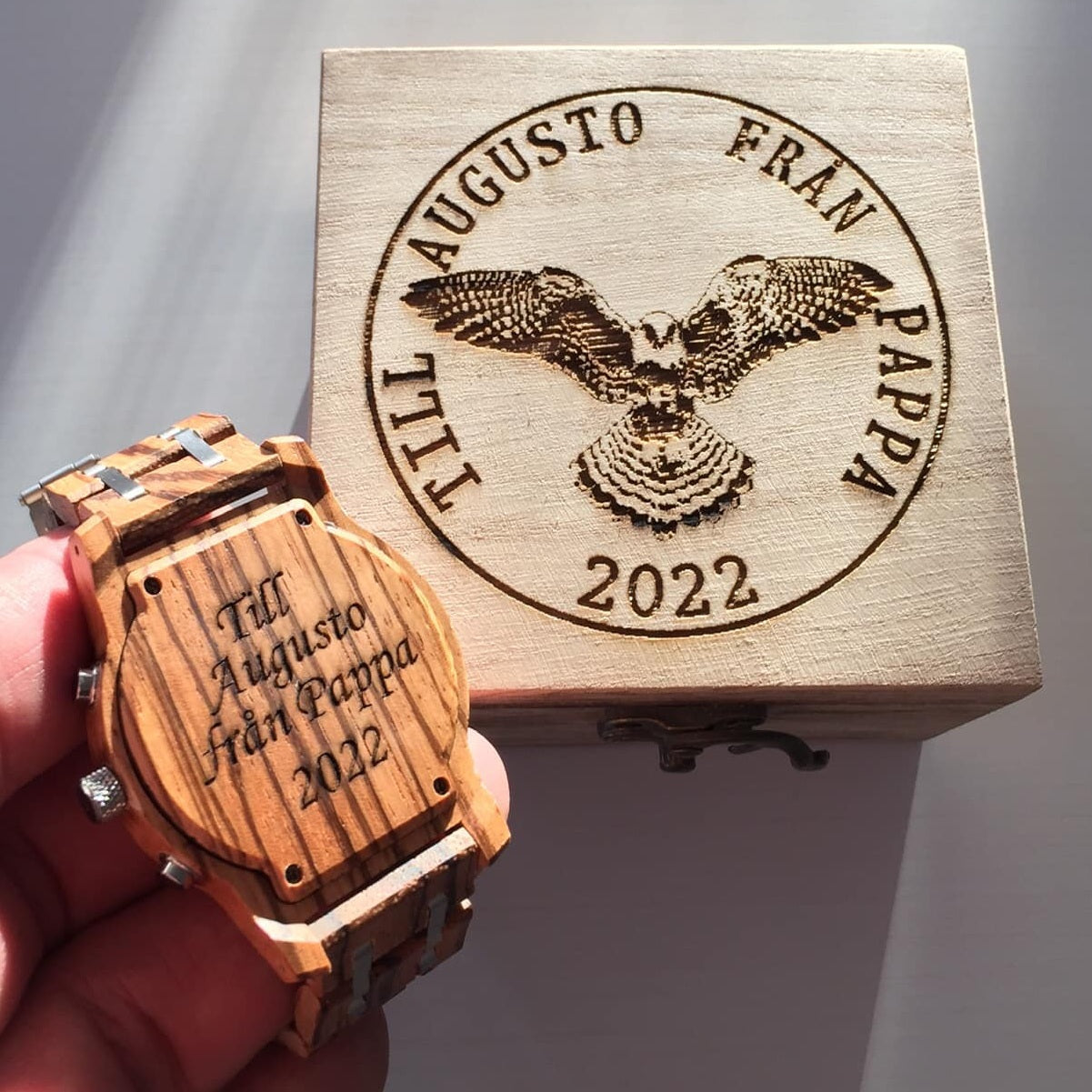 Alla klockor levereras i trälåda som du kan gravera som du vill.Välj bland våra förslag och lägg till egen text.....