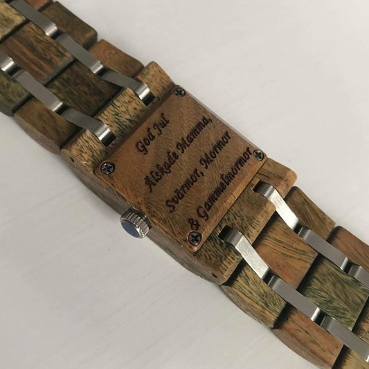 Alla klockor levereras i trälåda som du kan gravera som du vill. Välj bland våra förslag och lägg till egen text.....