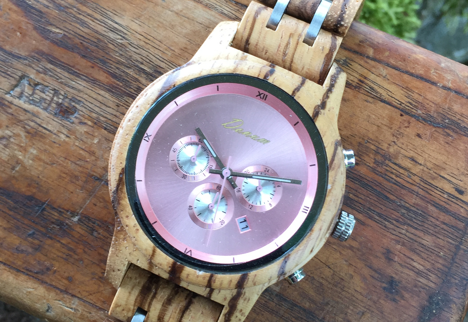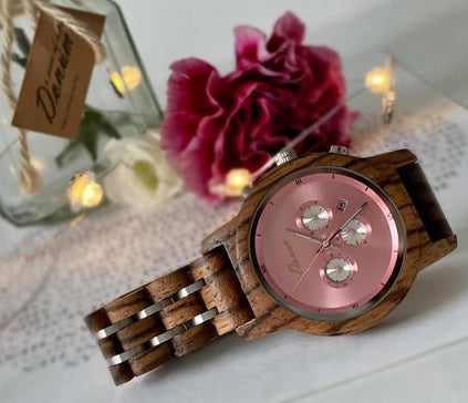 Rosa skålad urtavla, romerska siffror, zebraränder och rostfritt stål. En härlig kombination och återigen, en lyckad mix, av naturliga material och modern ingenjörskonst.